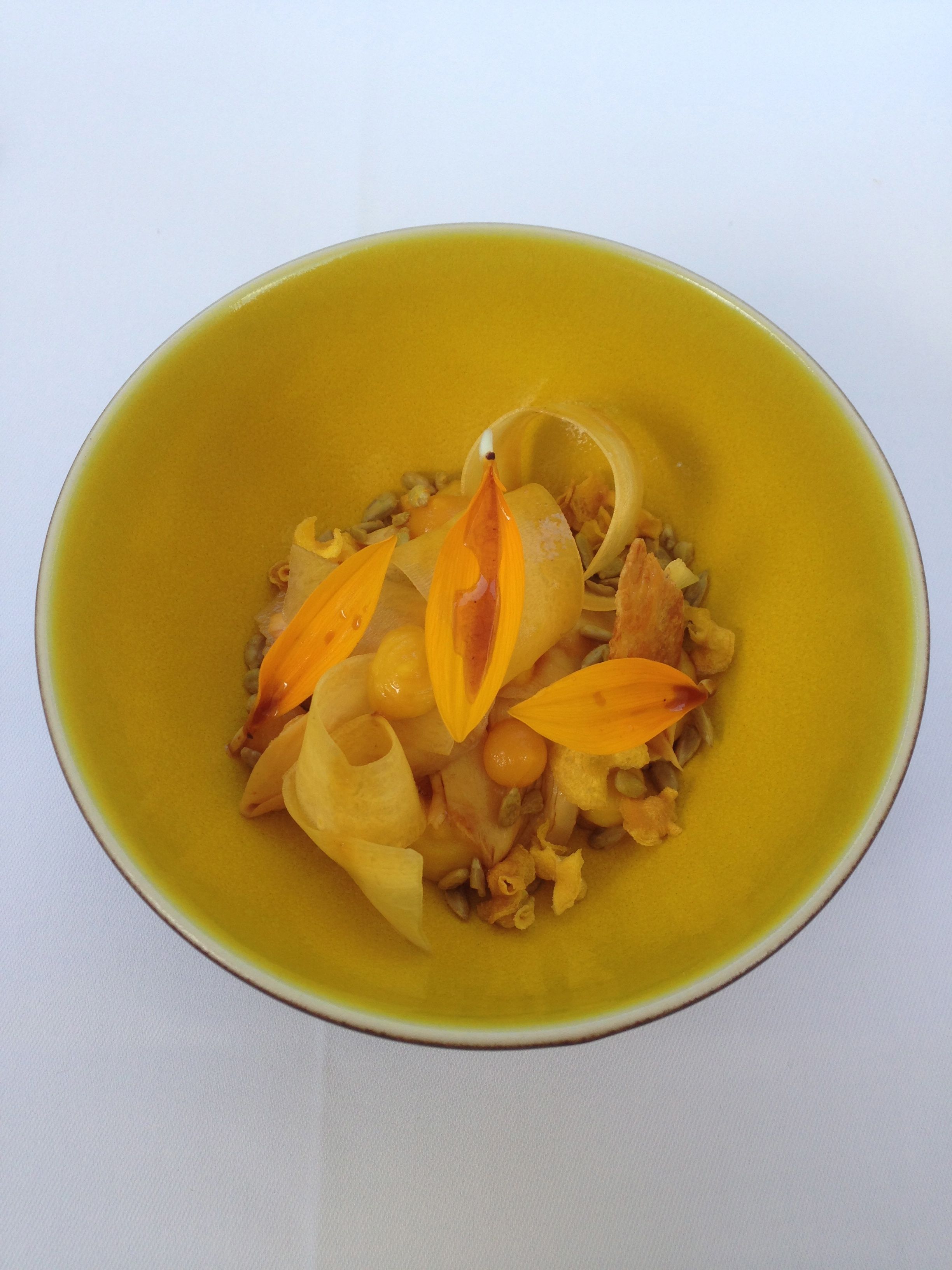 20160806 – Stucki – 21 Published August 7, 2016 at 2448 × 3264 Cornfed chicken smoked with chamomile, sunflower and saffron carrot @ Stucki Basel
